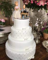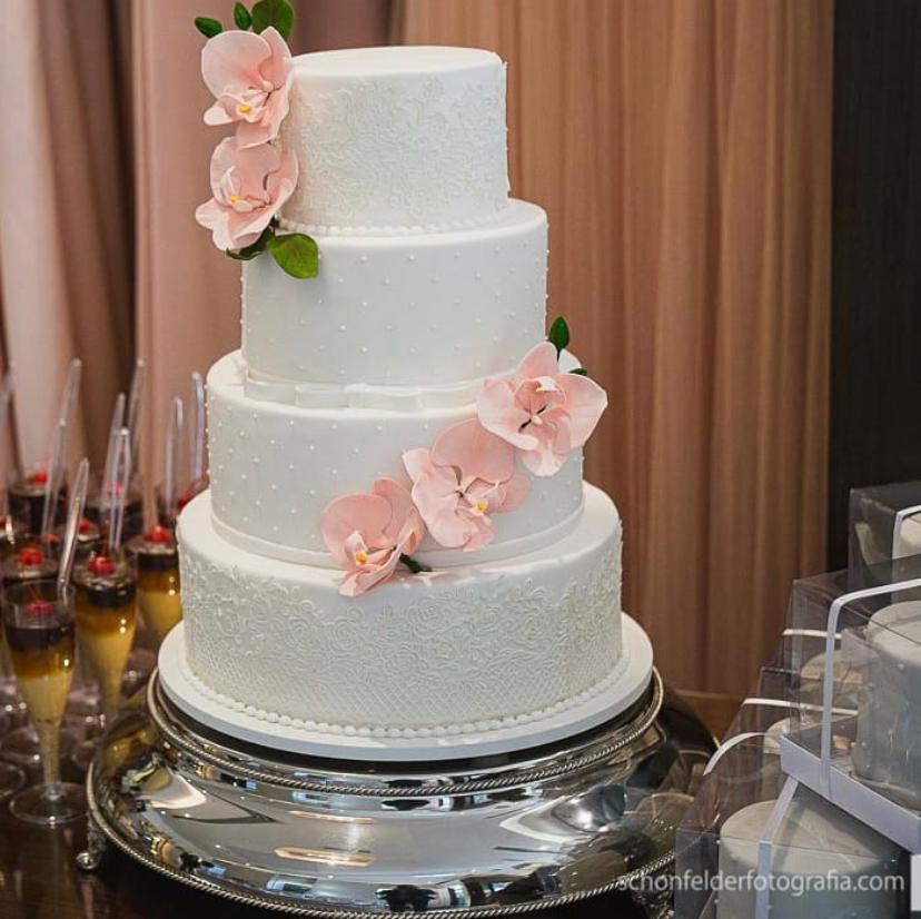4. Passe cola CMC nas pontas e dobre até o meio para colar. Junte os dois laços com uma tira menor. Passe pó perolado no laço. Corte as pontas em diagonal e passe nelas o pó perolado. Passe glacê perolado nas pontas e cole no bolo, assim como no laço.