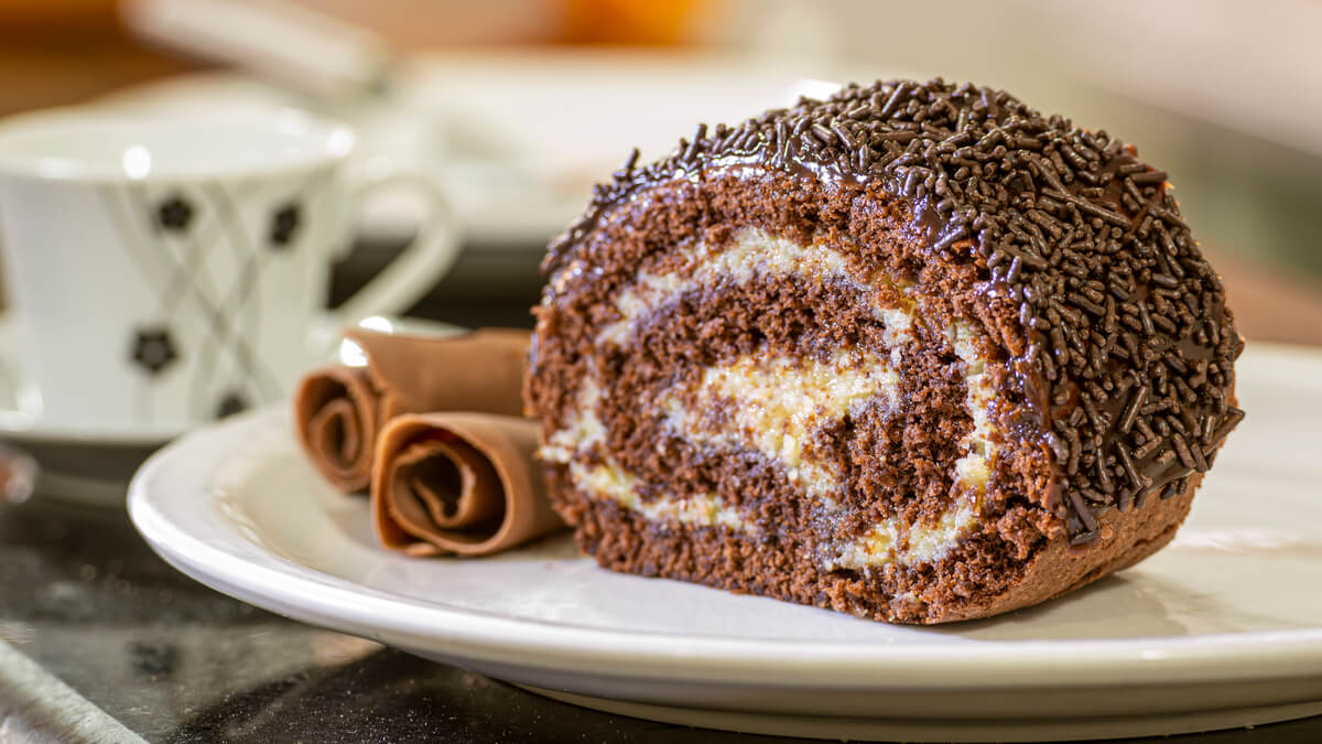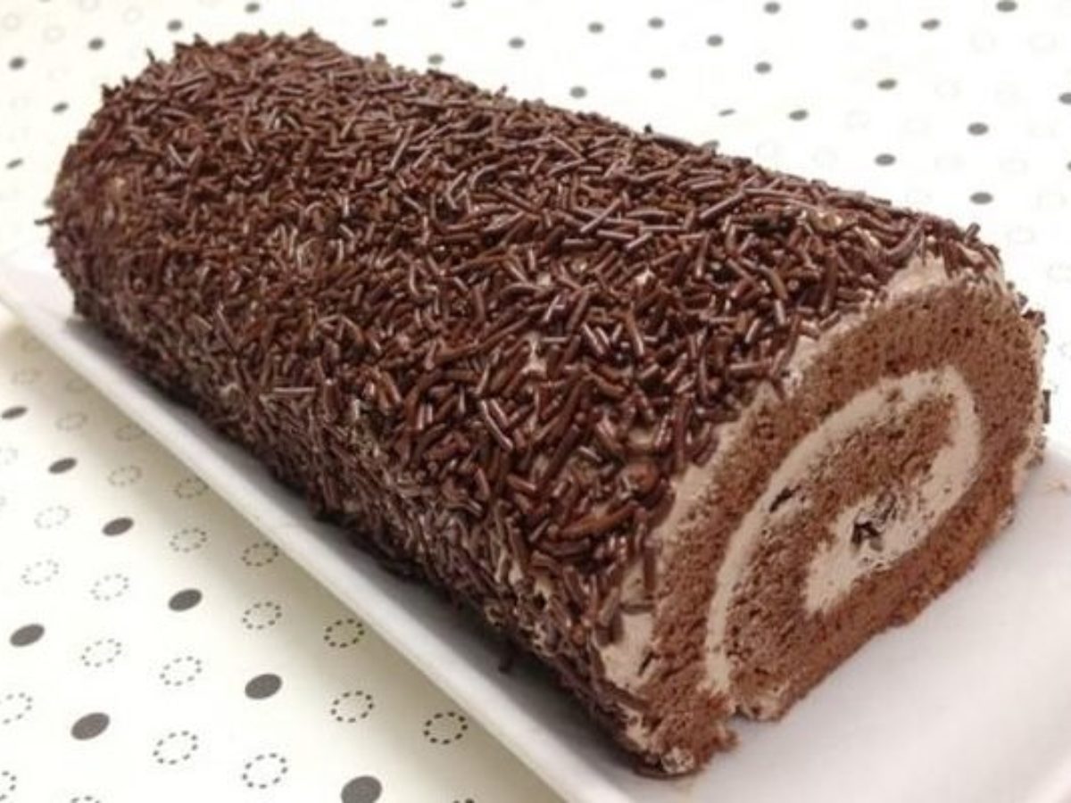 Coloque o restante do recheio por cima do rocambole e salpique com chocolate granulado.