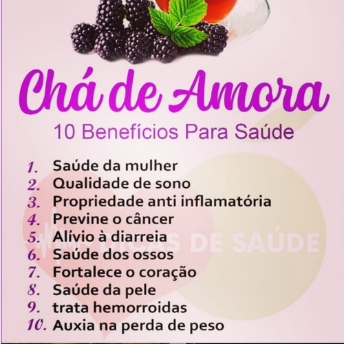 Os benefícios da amora não estão somente no fruto, mas também nas folhas. Esta receita, inclusive, aproveita apenas as folhas da amoreira negra (ou amoreira miura) para fazer um chá rico em ferro, cálcio, proteínas e sais minerais. Esta bebida auxilia na prevenção do diabetes, diminuindo as taxas de açúcar no sangue; ajuda a combater o colesterol, eliminando gorduras acumuladas no fígado e em outras vísceras; e alivia os sintomas da menopausa.